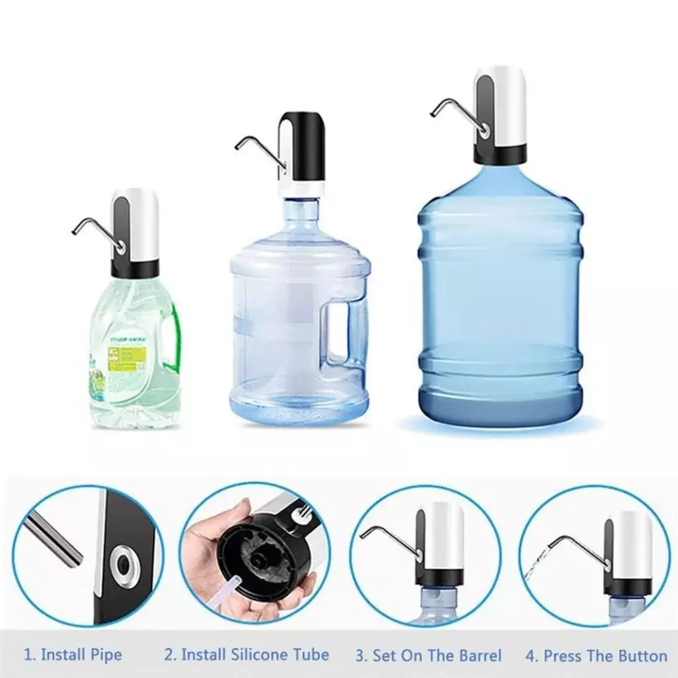 A bomba para galão de água elétrica recarregável é universal, queserve galões e garrafões de 5L, 10L, 20L e similar.É um produto inovador que torna o processo de retirada de água de galões e garrafões simples.