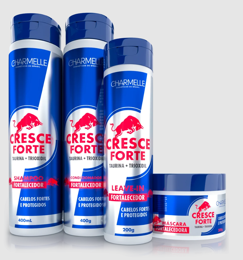 O Kit fortalecedor cresce forte charmelle cosméticos do Brasil possui uma fórmula desenvolvida com ativos que favorecem o crescimento e fortalece os fios, balanceada com tensoativos suaves associados a cafeína, pantenol e biotina que confere força, maciez e brilho intenso aos fios.