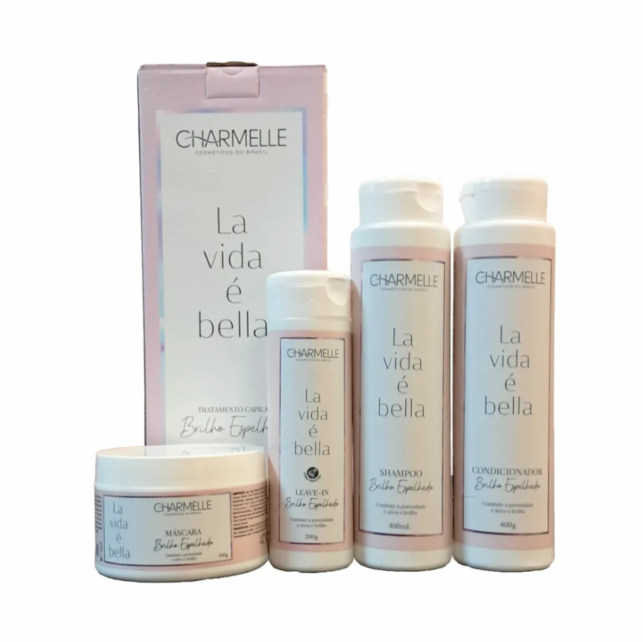 O Kit Capilar Charmelle La Vida É Bella, com sua promessa de "Brilho Espelhado", indica que sua principal função é proporcionar um tratamento capilar que deixa os cabelos brilhantes e radiantes. A linha provavelmente contém ingredientes que ajudam a selar as cutículas capilares, refletindo a luz e proporcionando um efeito de brilho intenso.