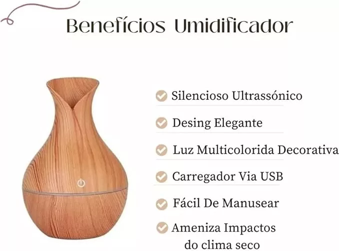 Feito para trazer mais conforto ao seu ambiente, esse umidificador será perfeito! Com um design elegante e moderno simulando madeira, vai trazer ainda mais charme para sua casa, sendo uma fusão perfeita de funcionalidade e estilo. Conectando facilmente ao USB, já estará pronto para respirar ar fresco e umedecido onde quer que esteja, podendo levar para diversos lugares, graças ao seu tamanho compacto e leve. Feito com materiais de alta qualidade, o umidificador proporciona uma ótima resistência e durabilidade.