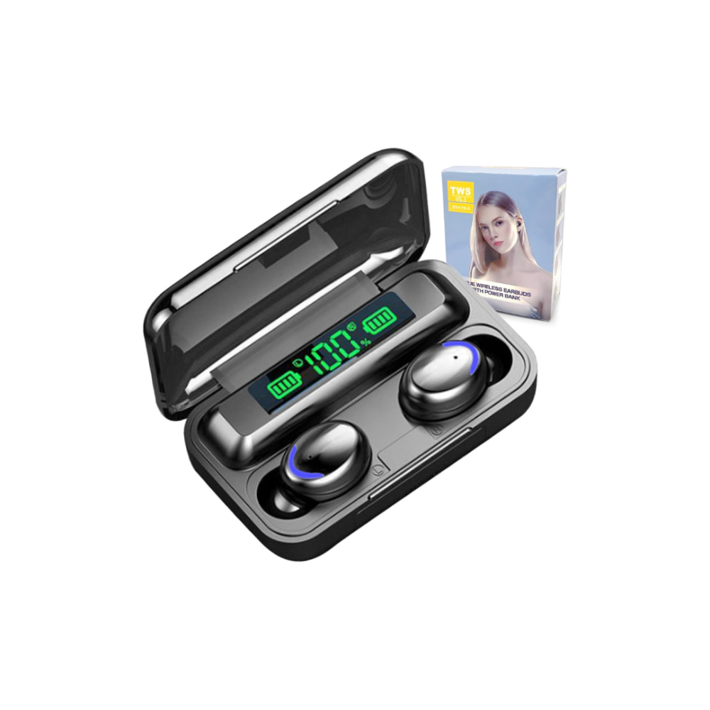 Fone De Ouvido Bluetooth TWS F9-5 Bluetooth 5.0, POWER BANK (Carrega cerca de 5 a 15 % da capacidade da bateria do celular) e com microfone para atender chamadas telefônicas.