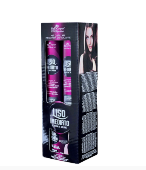 A linha Liso Imediato Bell Corpus agora está completa com um kit incrível que vai te surpreender!!! O Shampoo Liso Imediato Bell Corpus foi desenvolvido para uma limpeza suave, hidratante e eficaz dos cabelos. Sua fórmula é leve e de fácil aplicação. Possui ativos exclusivos que alinham os fios e diminuem o volume e o frizz. Rico em Aminoácidos essenciais para os cabelos e Queratina. Também possui em sua composição o D-Pantenol que garante a proteção da cor dos fios. O Condicionador Liso Imediato Bell Corpus foi desenvolvido para deixar seus cabelos macios, com mais brilho e leveza. Sua fórmula é leve e de fácil aplicação. Possui ativos exclusivos que alinham os fios diminuindo o volume e o frizz. Rico em Aminoácidos essenciais para os cabelos e Queratina. Também possui em sua composição o D-Pantenol que garante proteção da cor para os cabelos. O Condicionador Liso Imediato é ideal para desembaraçar o cabelo sem quebrar os fios, deixando-os alinhados, macios e brilhantes.