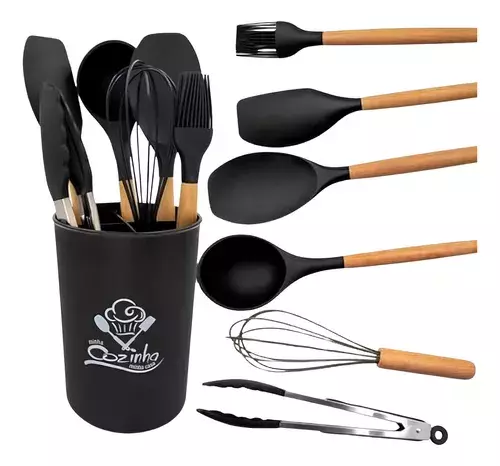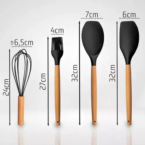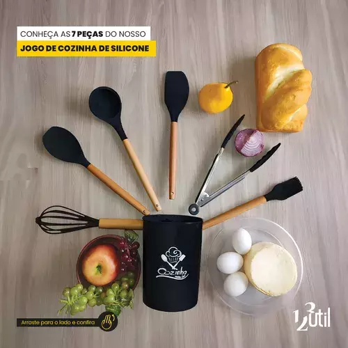 Kit 7 Pçs Utensílios de Cozinha Silicone Cabo Madeira