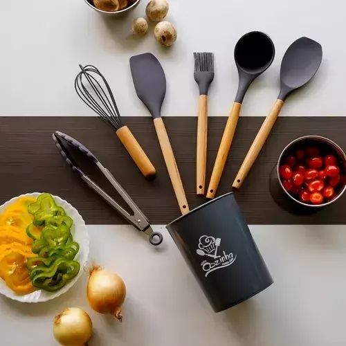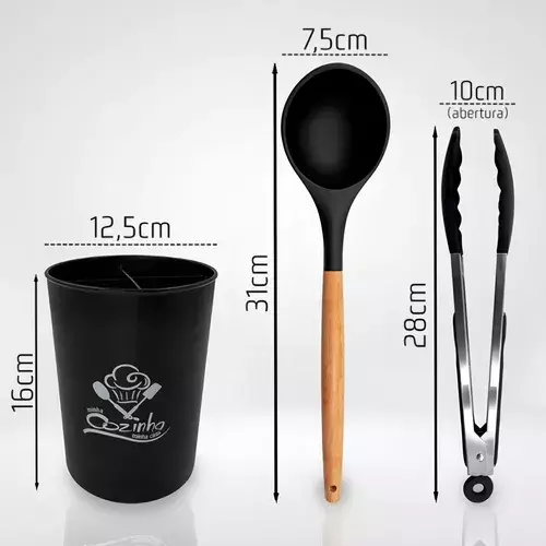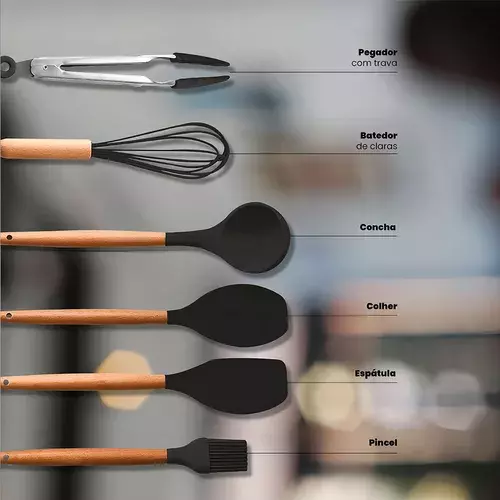 Facilite seus preparos na cozinha com nosso Kit Talheres de Cozinha de 7 Peças, combinando a praticidade do silicone Premium com a elegância da madeira. Cada peça foi cuidadosamente selecionada para garantir uma experiência culinária sem preocupações.Composição:Plásticos - Aço Inox - Madeira - SiliconeFácil Limpeza: O silicone antiaderente permite uma limpeza fácil com água quente e detergente, mantendo seus utensílios sempre prontos para o próximo uso.Especificações:Material: Silicone e MadeiraModelos: 6 peças + Porta UtensíliosCaracterísticas: Ecologicamente Sustentável, ResistenteNão tóxicoConteúdo da Embalagem:01 Batedor de Claras 26cm01 Colher 31cm01 Concha 31cm01 Pincel de Cozinha 27cm01 Espátula 31cm01 Pegador 26,5cm01 Balde Porta Utensílios 16cm x 10cmTransforme sua experiência na cozinha com praticidade e estilo.