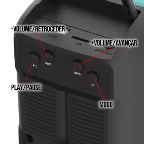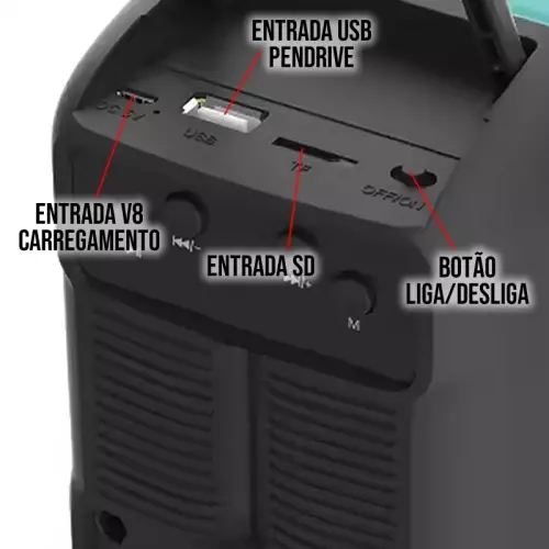 A caixa de somGTS-1881conta com dois alto-falantes de 5” polegadas cada, e potência de 10W e luz LED.Entradas para Pen Drive, cartão de memória, função rádio FM, bateria recarregável e inclui cabo V8 para carregamento.