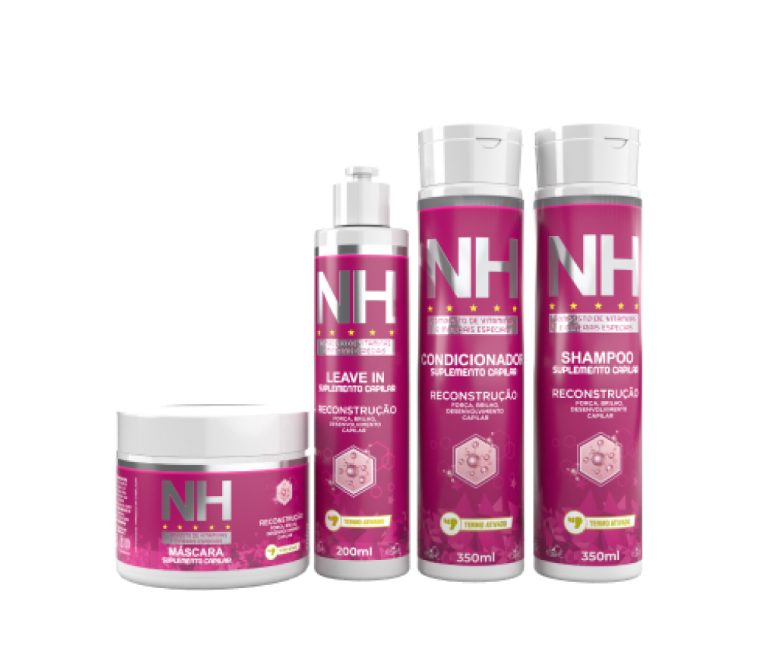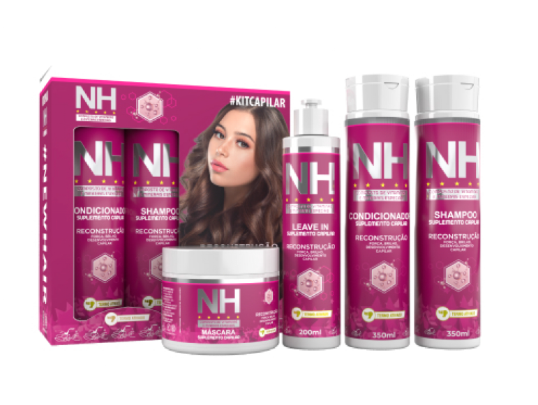 NH New Hair Kit Capilar possui funções múltiplas que aceleram o desenvolvimento dos seus fios. Contém shampoo, condicionador, leave-in e máscara com um complexo de aminoácidos que nutre a fibra capilar com vitaminas.