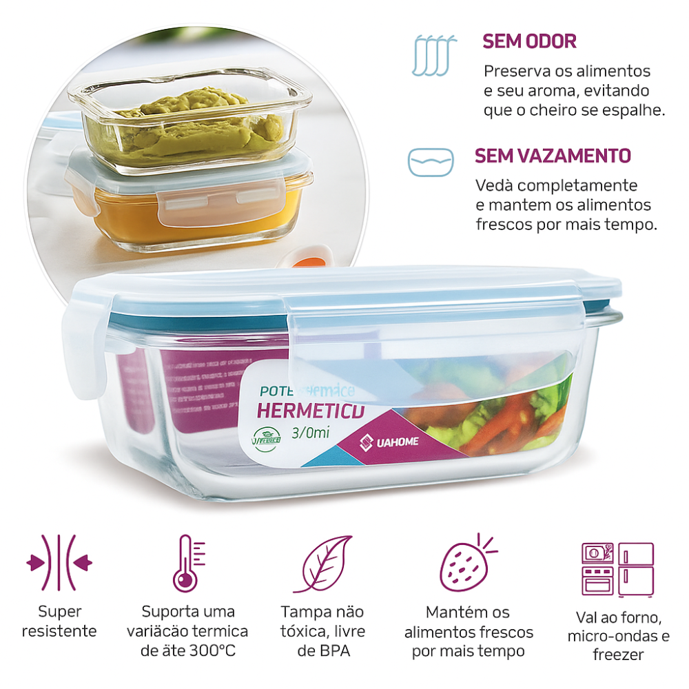 Pote Hermético de vidro borossilicato transparente, de alta resistente e qualidade com capacidade de 640ml. O pote hermético deve ser adicionado à lista de acessórios que não podem faltar na cozinha da sua casa. Ideal para armazenar e conservar temperos, condimentos, especiarias, grãos, mel, bolachas, doces, torradas e cereais, ele tem alto poder de conservação e mantém os alimentos com o sabor e texturas originais.